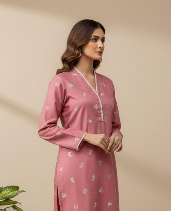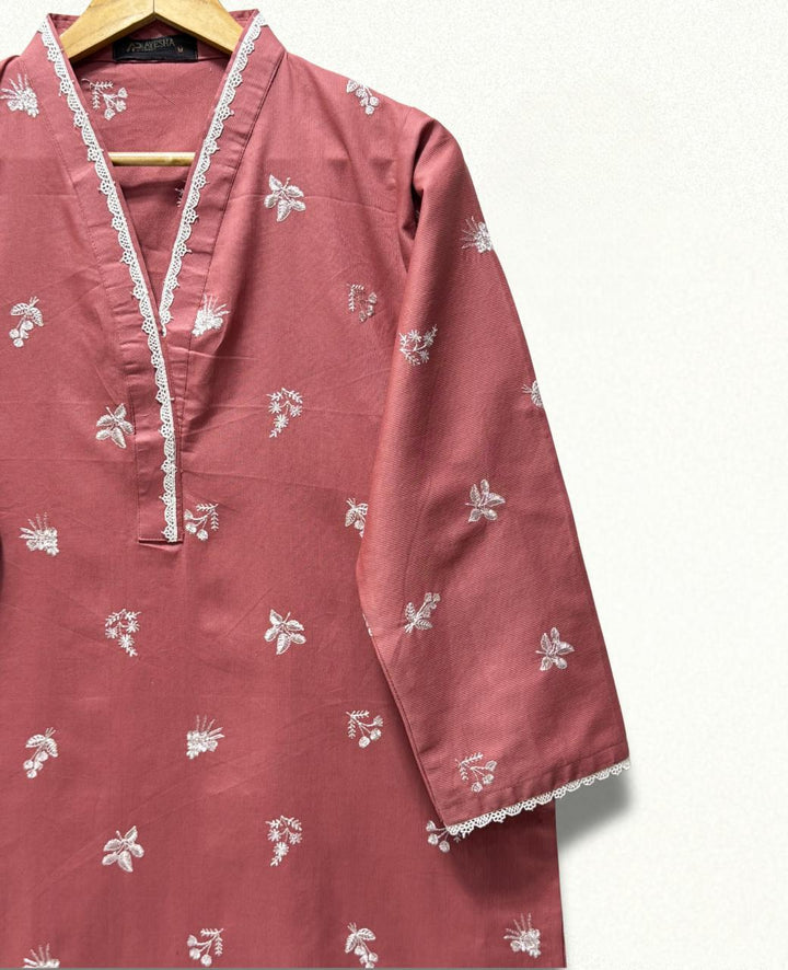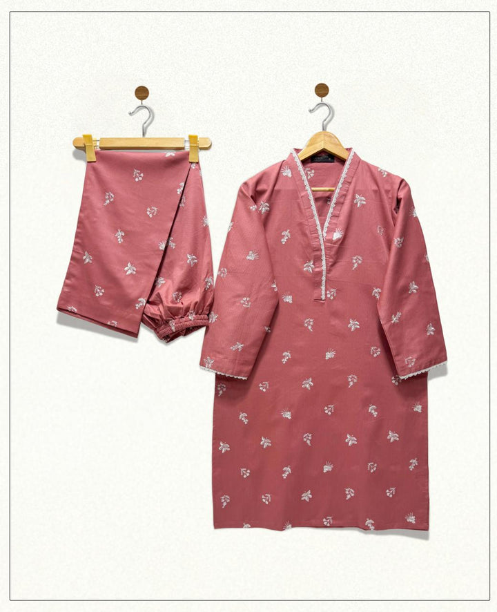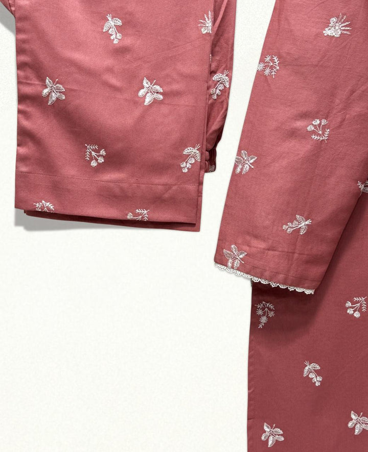 A beautifully crafted set featuring a fully embroidered shirt and trouser, designed to give you a refined and graceful look. Soft stripe cotton fabric with delicate lace detailing adds an elegant finishing touch — perfect for everyday chic and semi-formal outings.