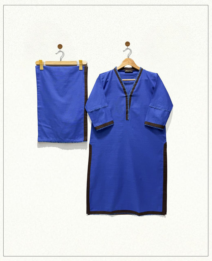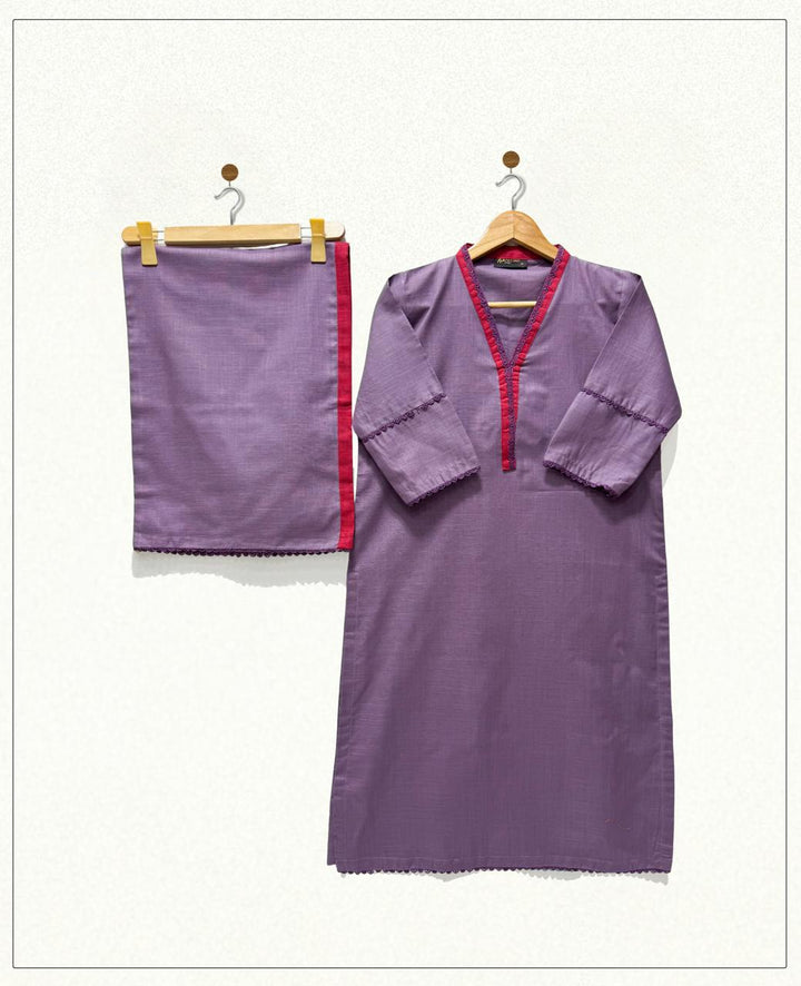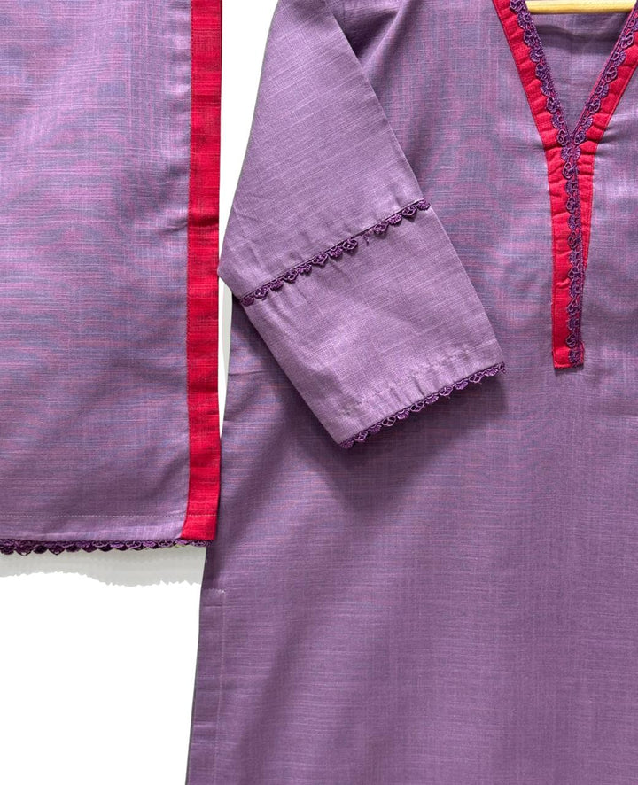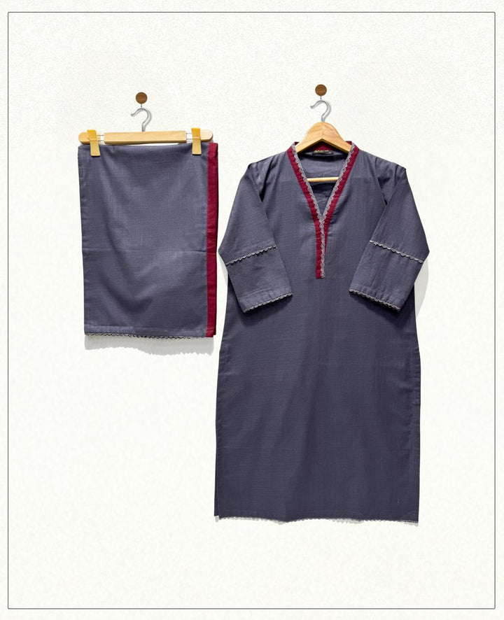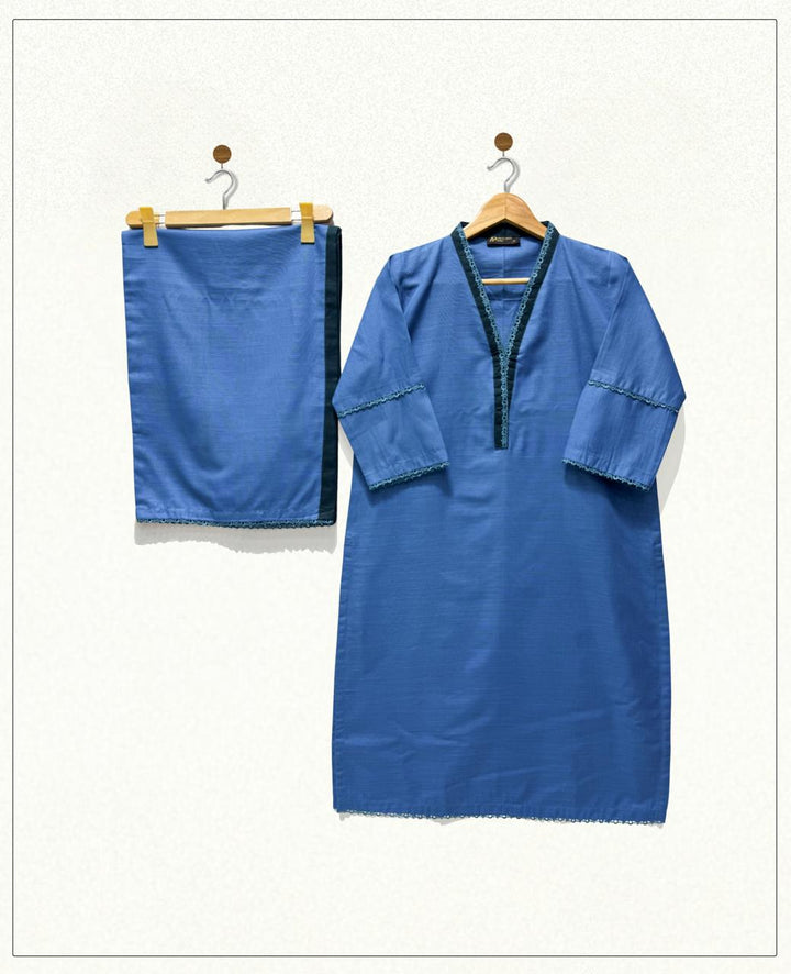 A chic khaddar two-piece featuring elegant lace detailing on the neckline, sleeves, and hem, beautifully enhanced with contrast applique work for a standout look. Designed with trendy 3-quarter sleeves and paired with a comfortable plazo for effortless style. Available in 6 beautiful colors—perfect for everyday wear and casual outings.