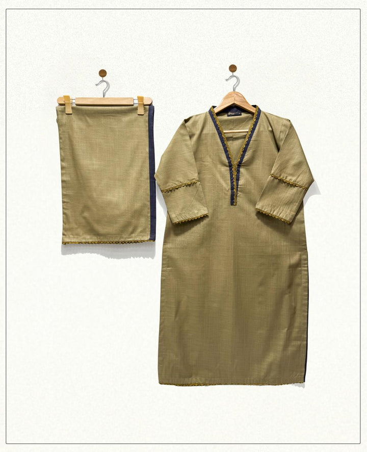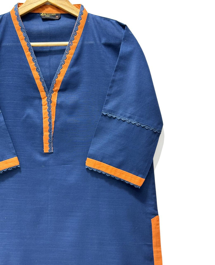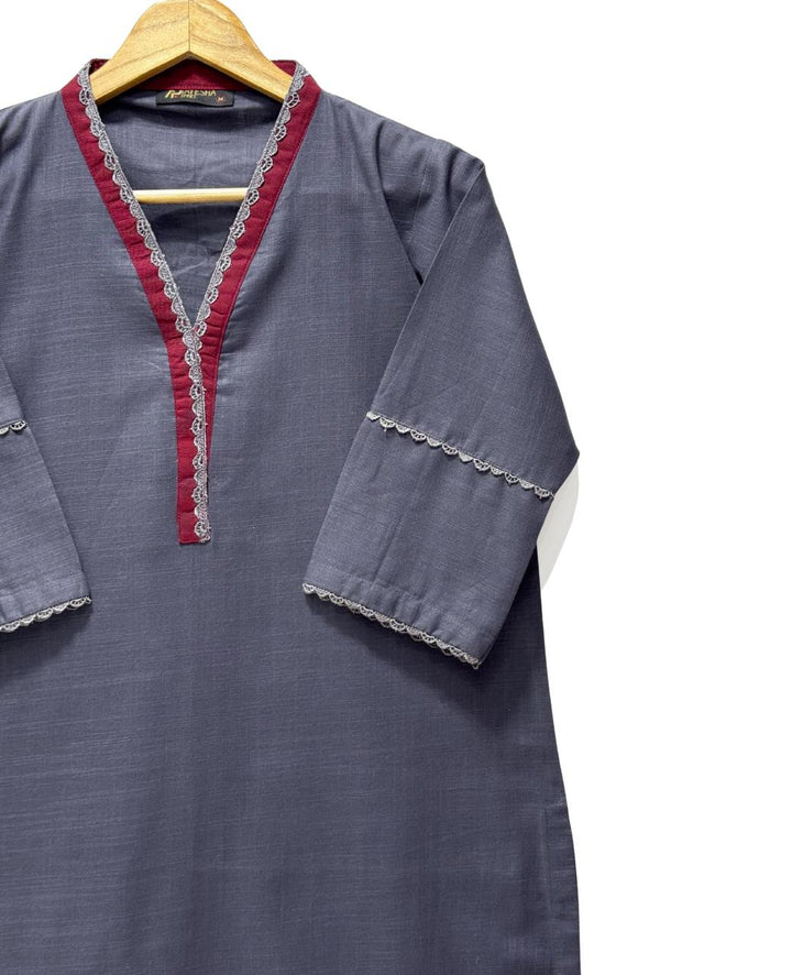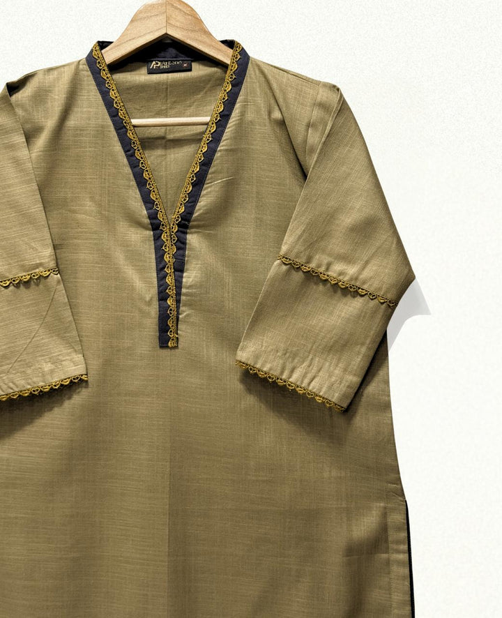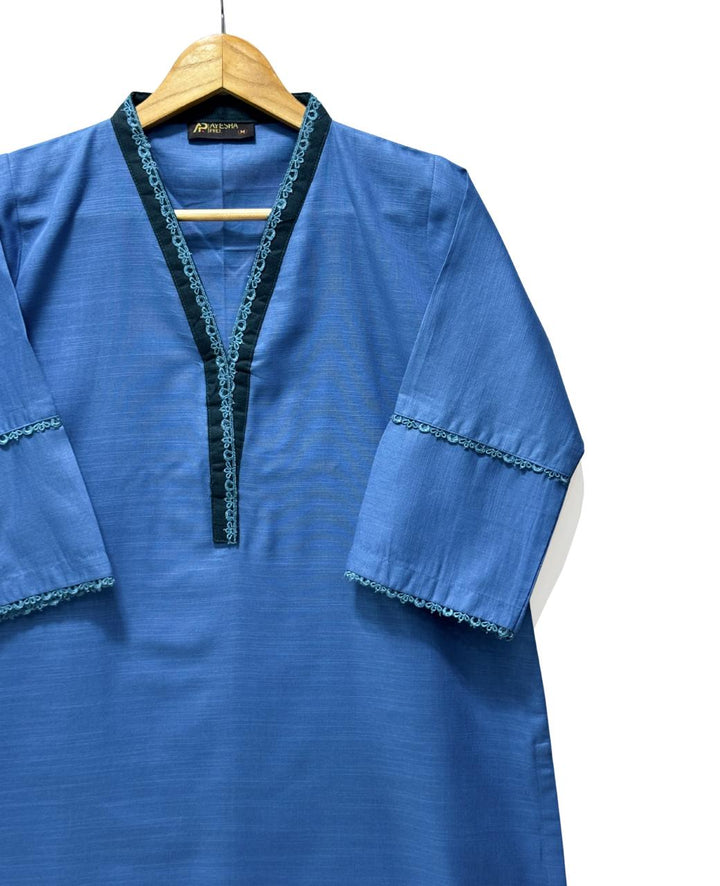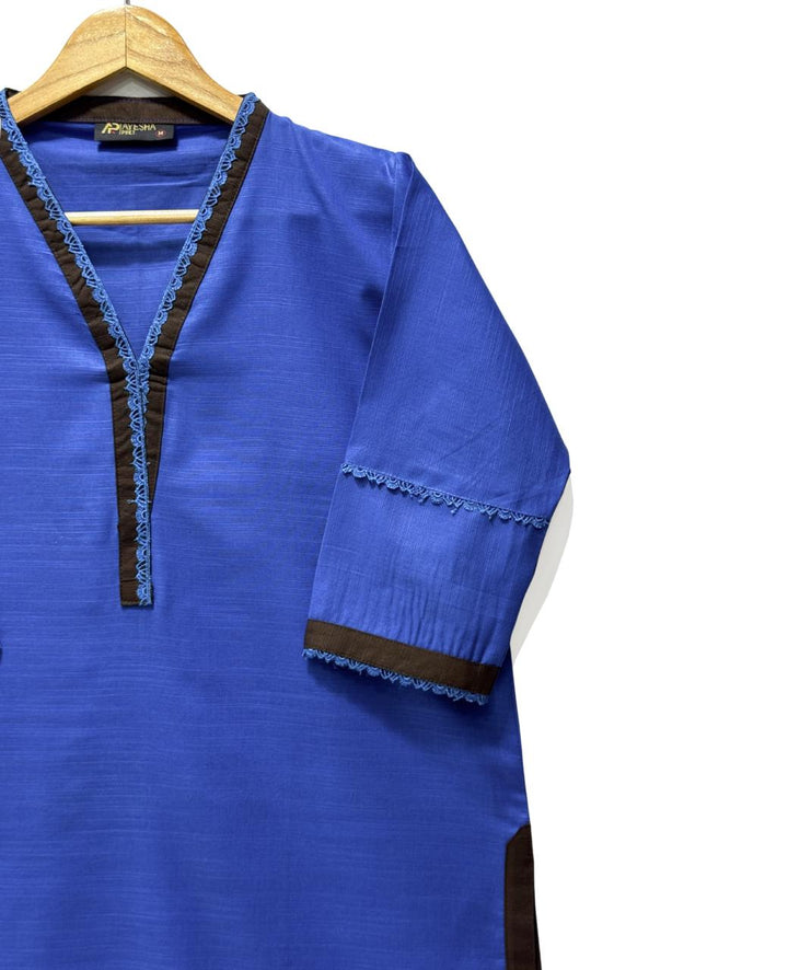 A chic khaddar two-piece featuring elegant lace detailing on the neckline, sleeves, and hem, beautifully enhanced with contrast applique work for a standout look. Designed with trendy 3-quarter sleeves and paired with a comfortable plazo for effortless style. Available in 6 beautiful colors—perfect for everyday wear and casual outings.