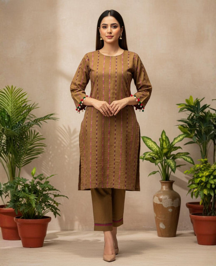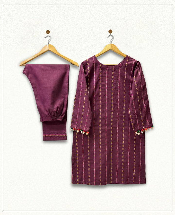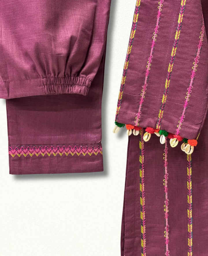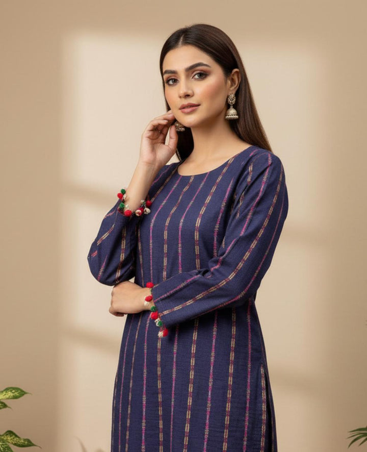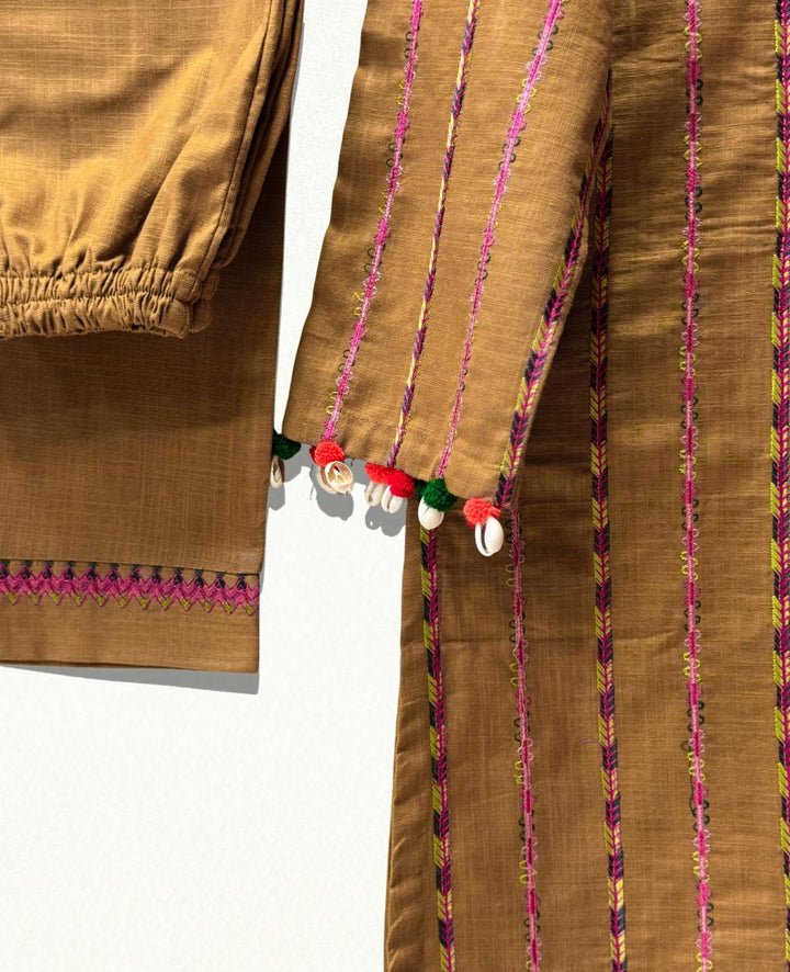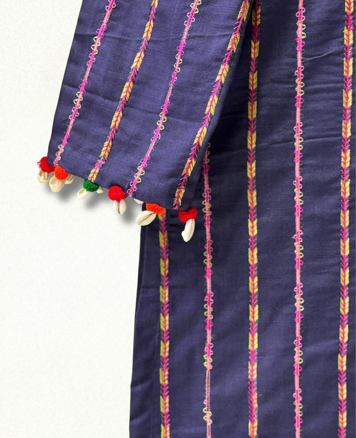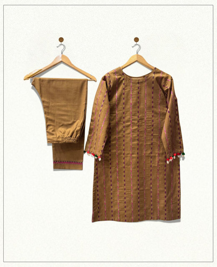A stunning khaddar shirt and trouser set, perfect for winter, featuring exquisite multi-stripe embroidery. Delicate seashells and velvet balls adorn the shirt's body and sleeves, adding a touch of elegance