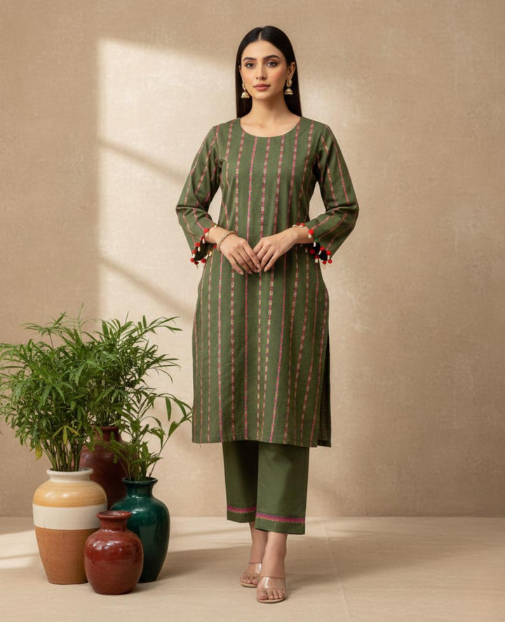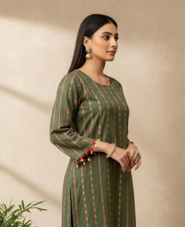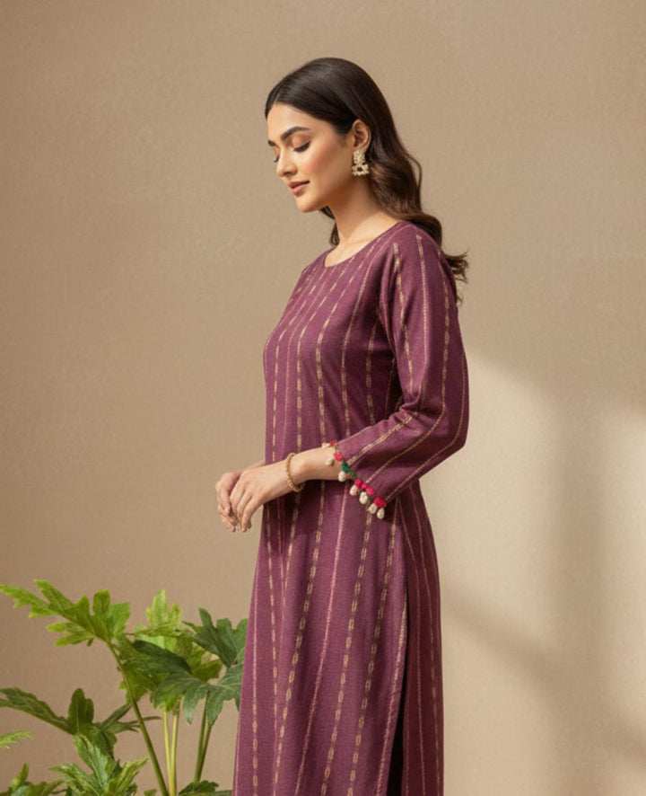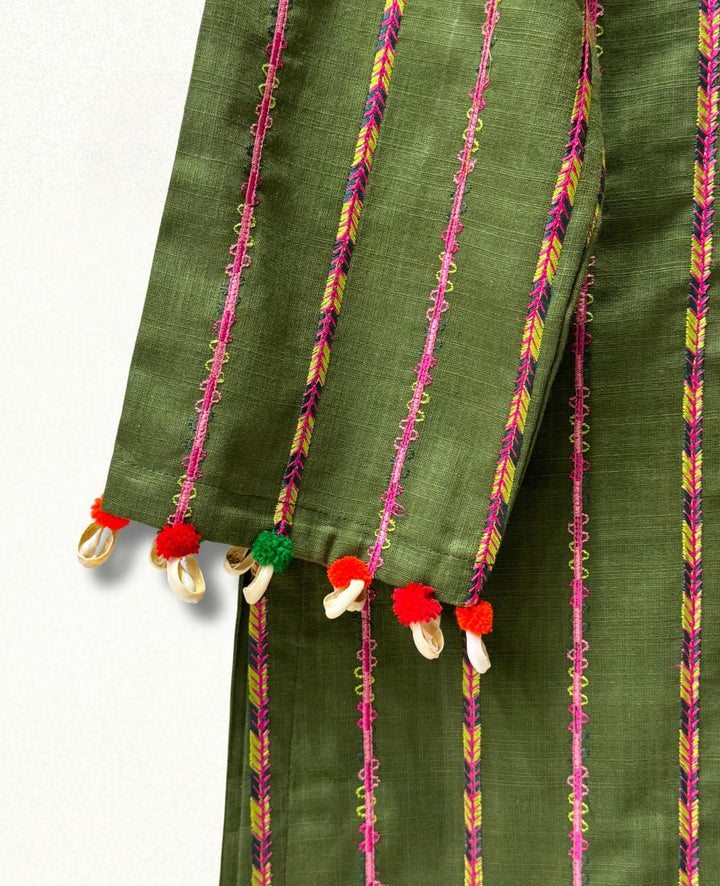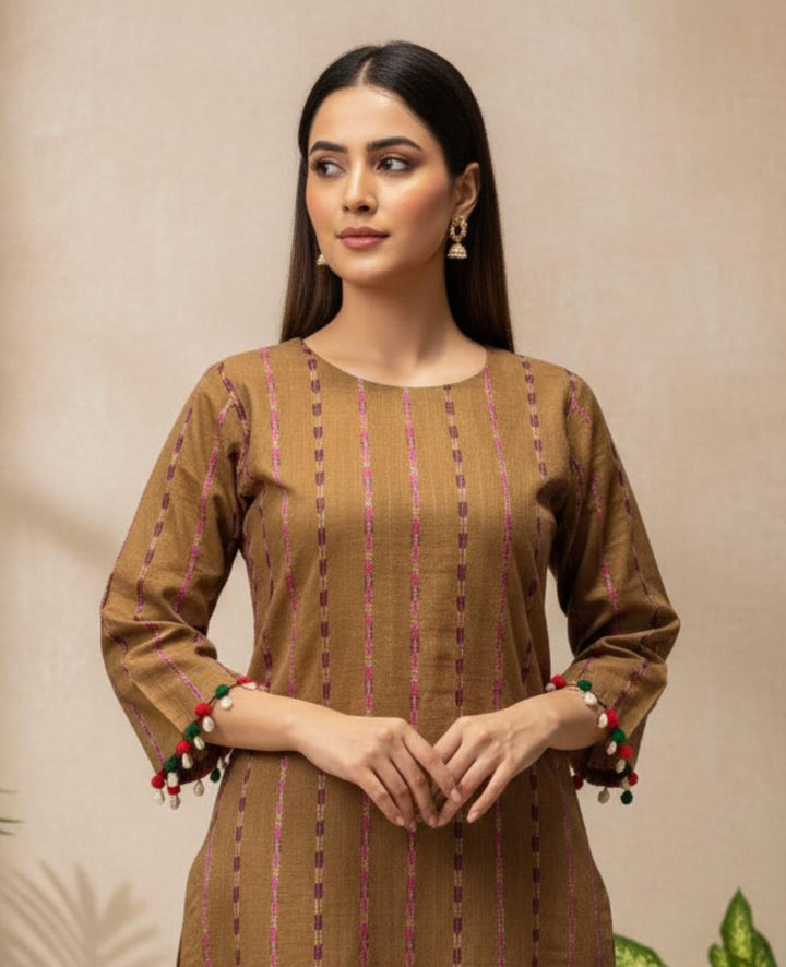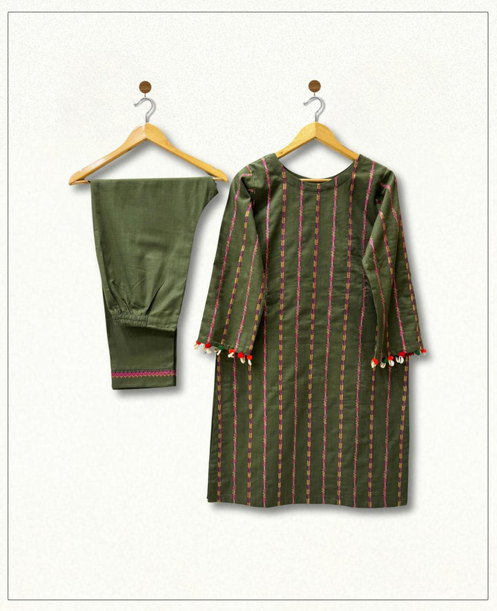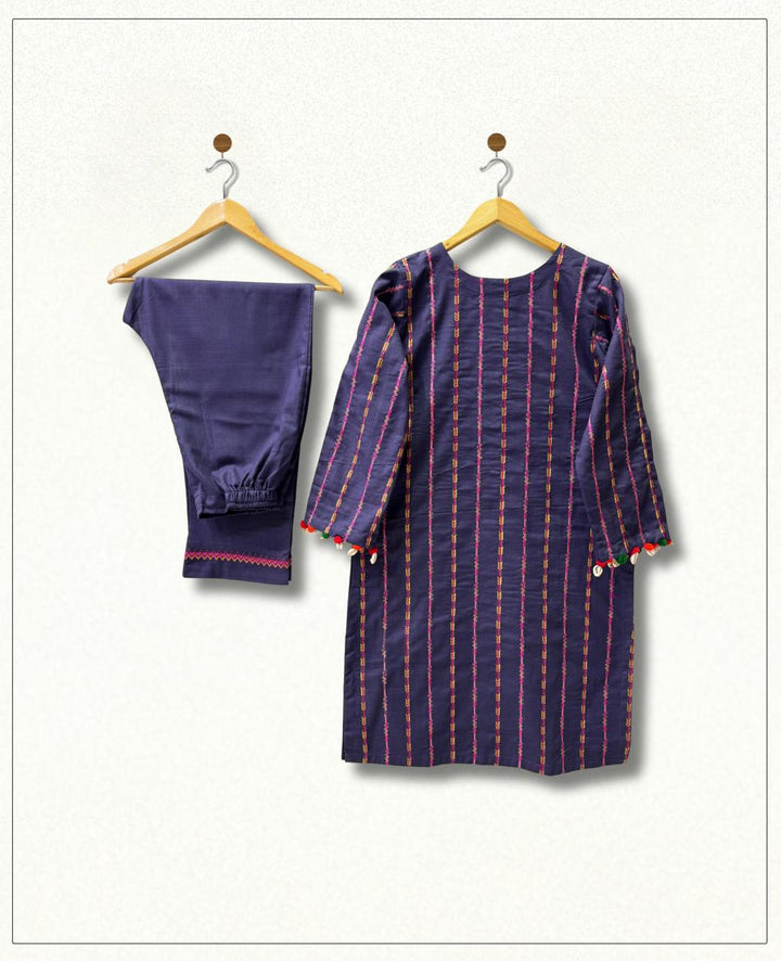 A stunning khaddar shirt and trouser set, perfect for winter, featuring exquisite multi-stripe embroidery. Delicate seashells and velvet balls adorn the shirt's body and sleeves, adding a touch of elegance