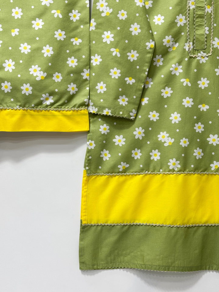 Exquisite Printed Lawn two-piece suit with intricate lace work, perfect for adding a touch of elegance to your wardrobe. Paired with stylish trouser plazo, this outfit offers comfort and sophistication. Ideal for casual gatherings or everyday wear.