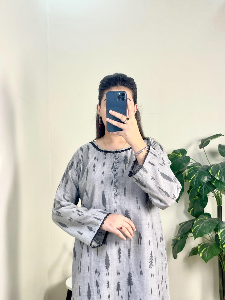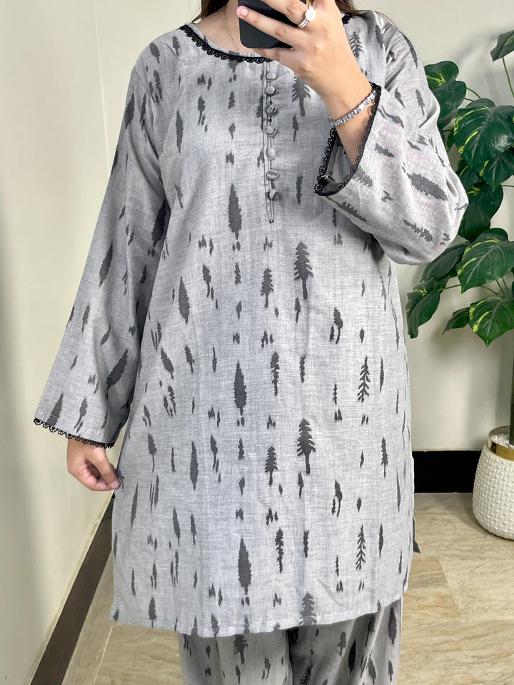 Rangoli lawn collection for summer featuring a 2-piece suit with a chic Alhad Salwar in a relaxed fit. The shirt showcases exquisite Rangoli weaving with intricate motifs and patterns exuding elegance and sophistication. Fabric buttons add a delicate touch to this stunning ensemble.