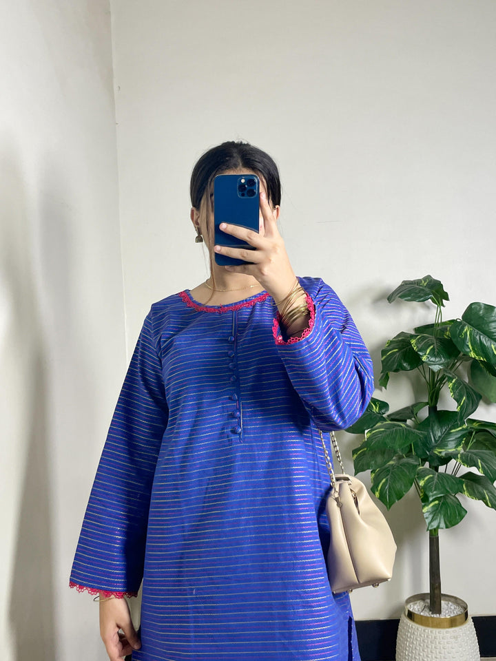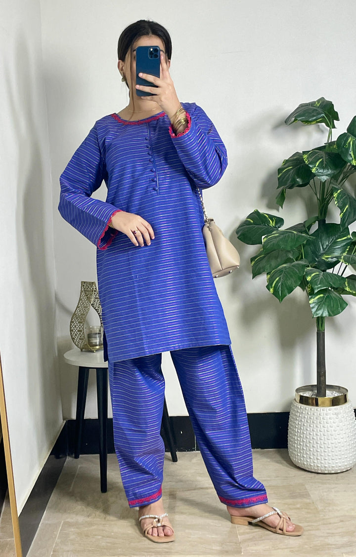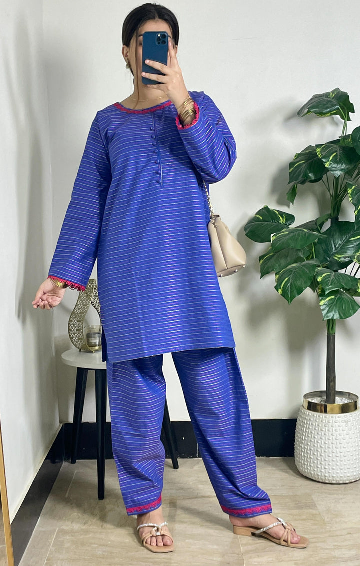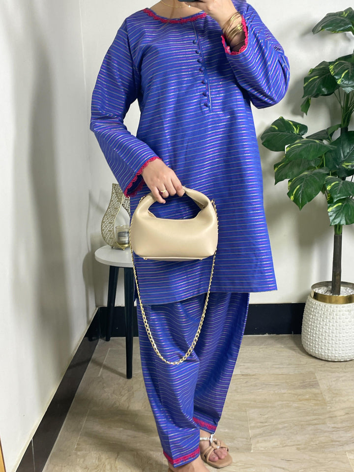 Rangoli lawn collection for summer featuring a 2-piece suit with a chic Alhad Salwar in a relaxed fit. The shirt showcases exquisite Rangoli weaving with intricate motifs and patterns exuding elegance and sophistication. Fabric buttons add a delicate touch to this stunning ensemble.
