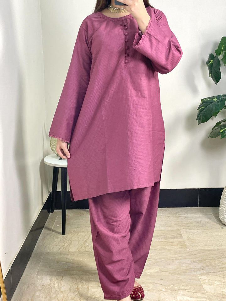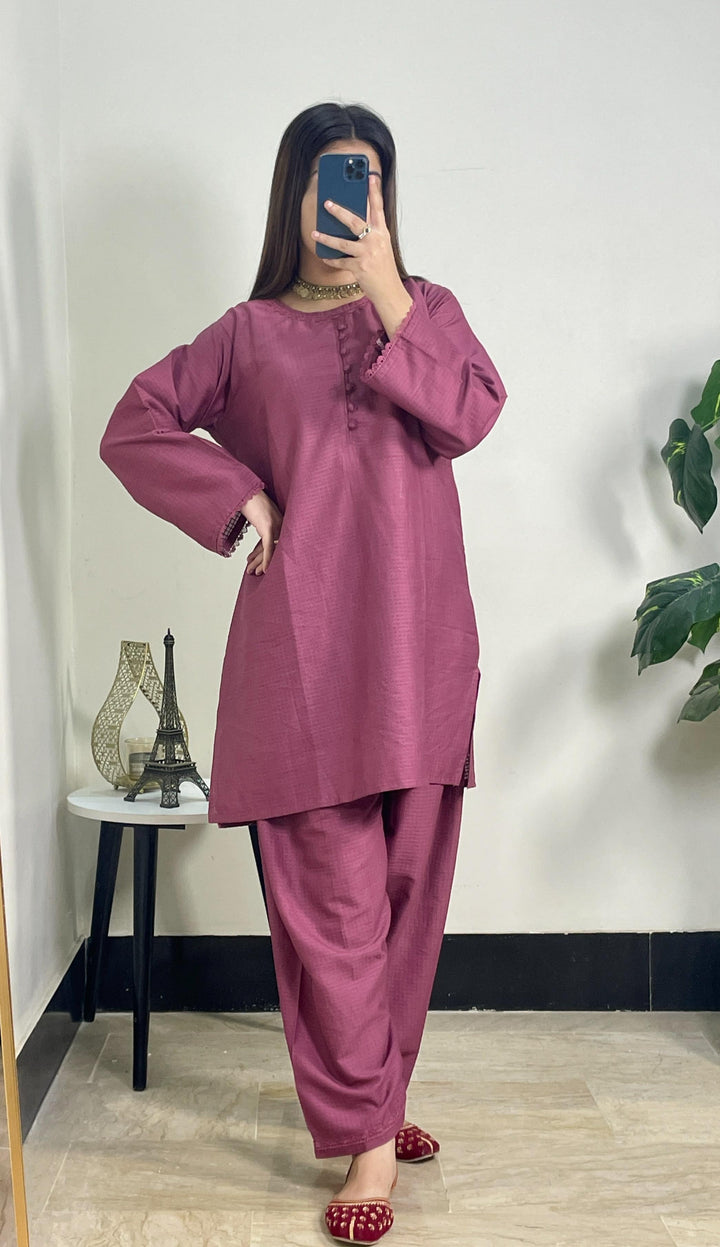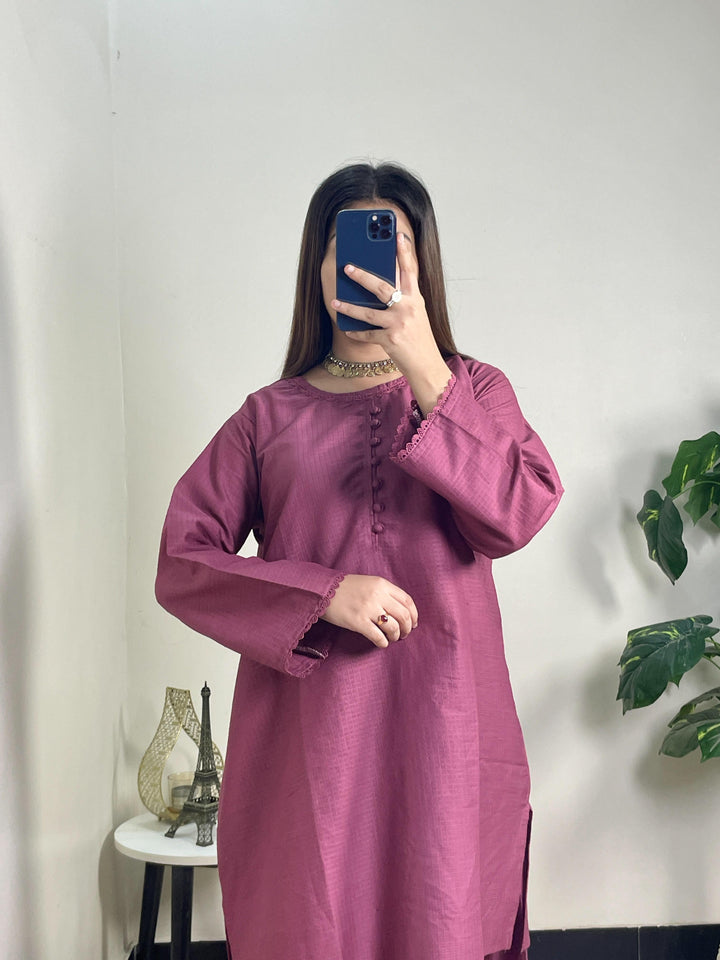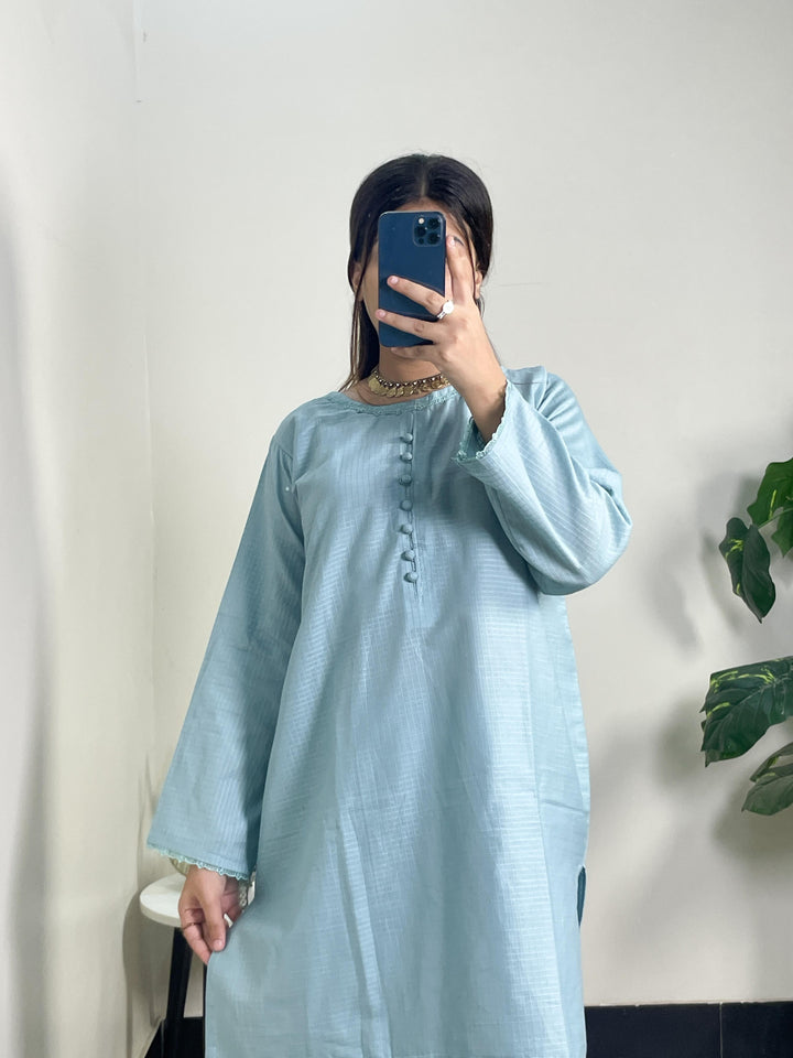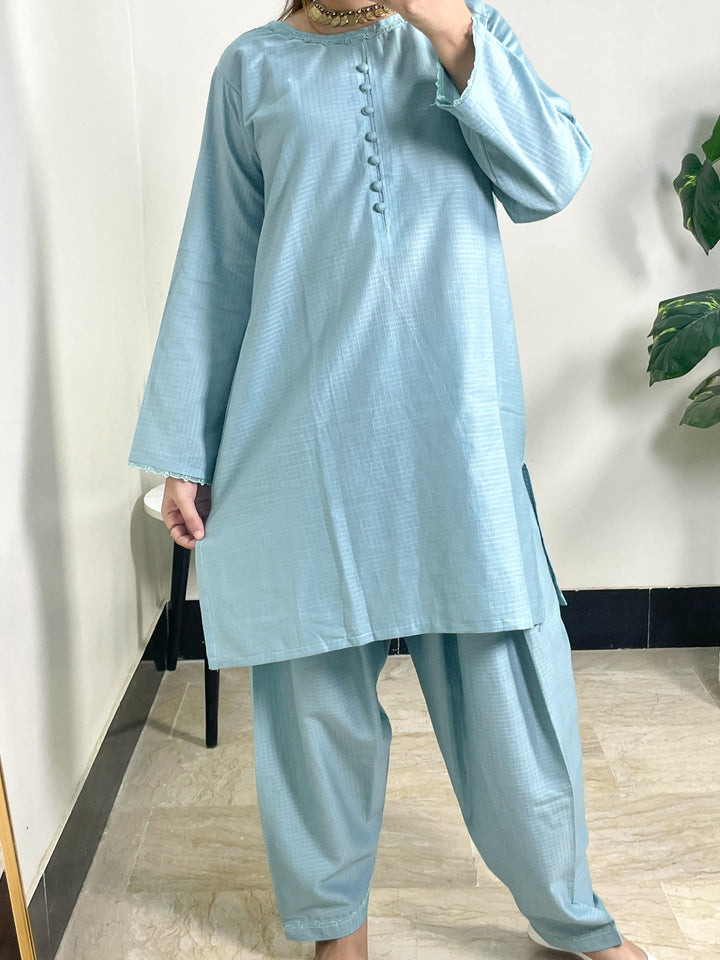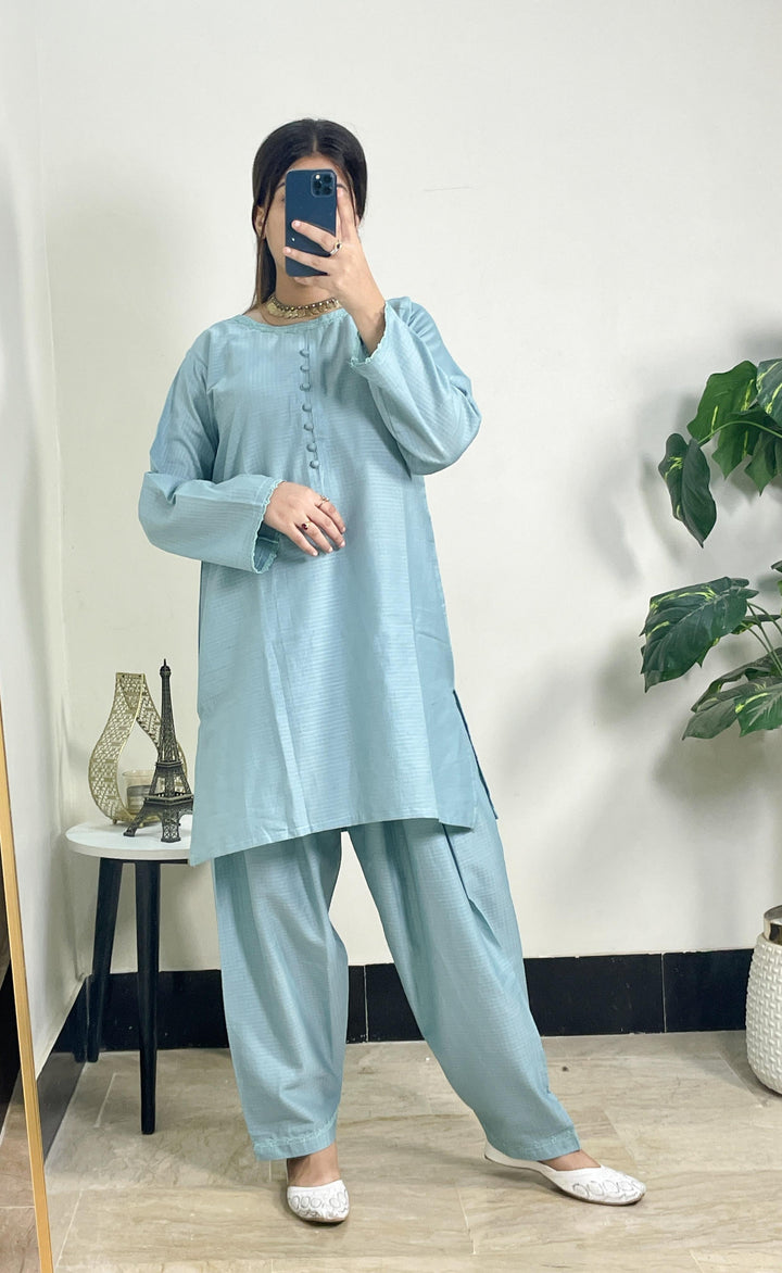 Rangoli lawn collection for summer featuring a 2-piece suit with a chic Alhad Salwar in a relaxed fit. The shirt showcases exquisite Rangoli weaving with intricate motifs and patterns exuding elegance and sophistication. Fabric buttons add a delicate touch to this stunning ensemble.