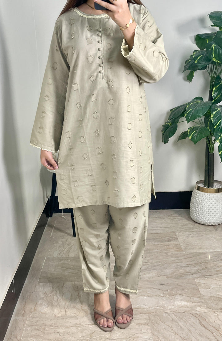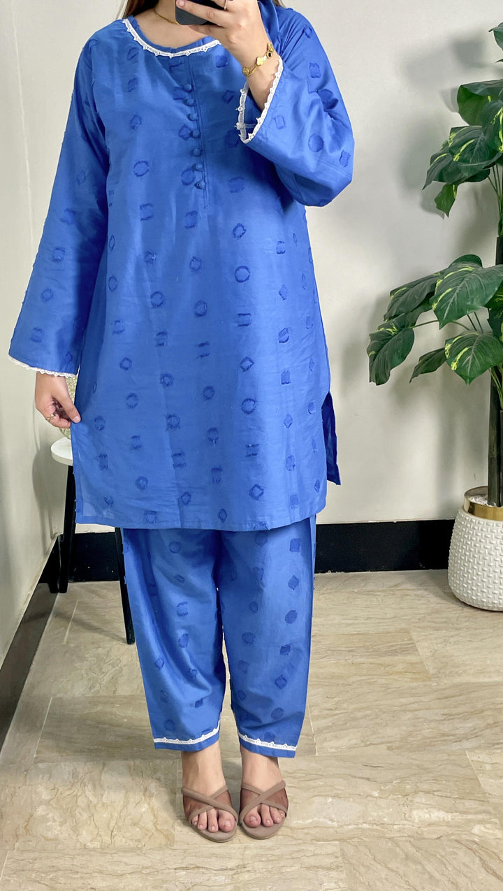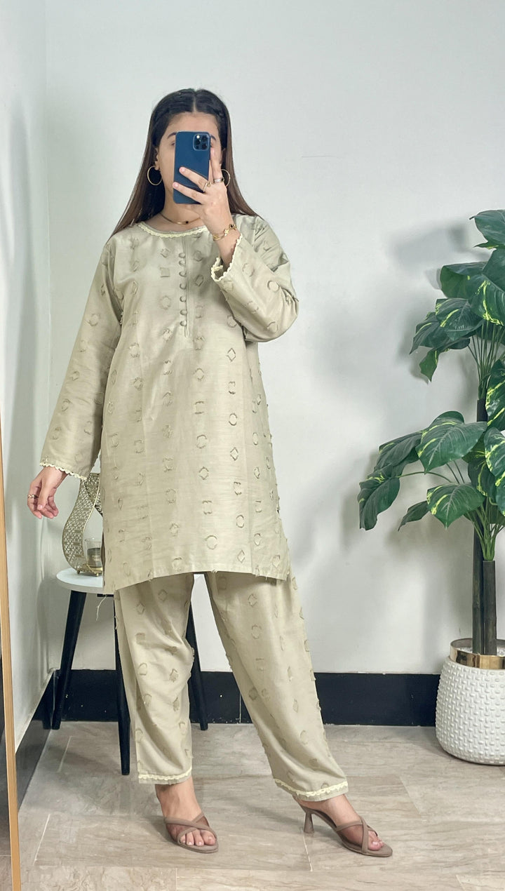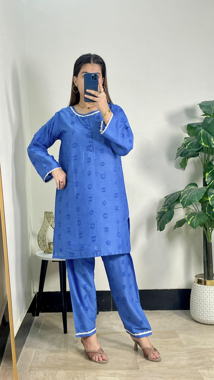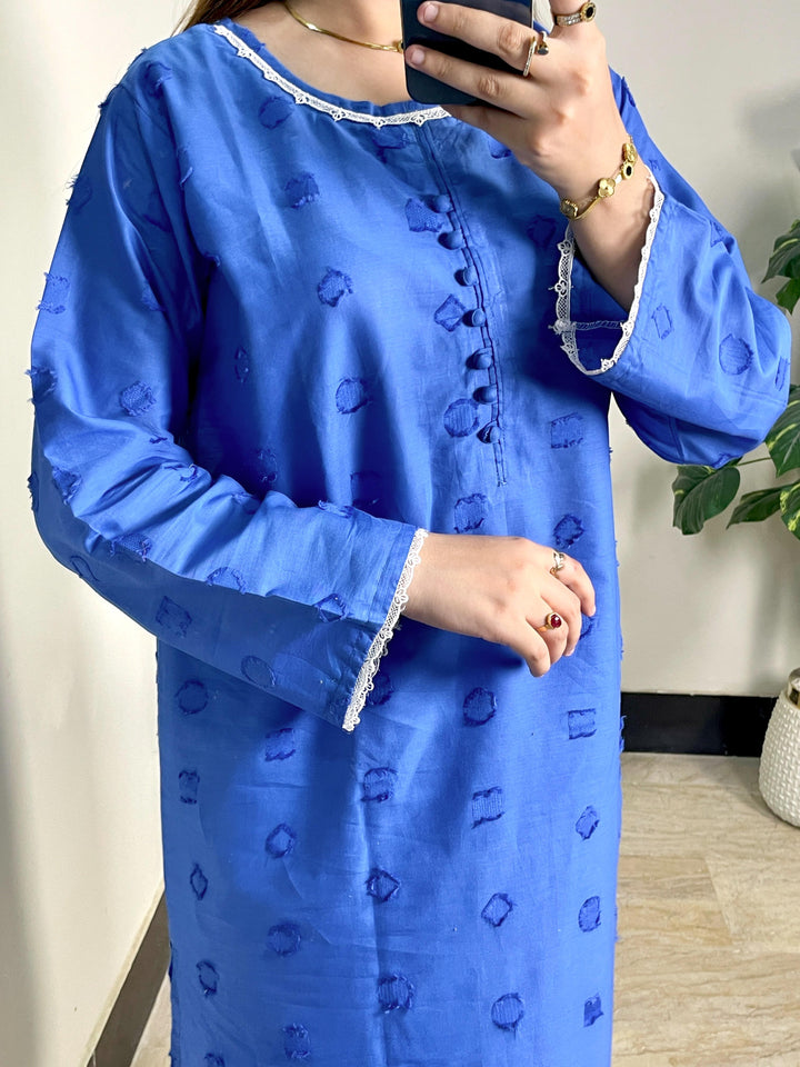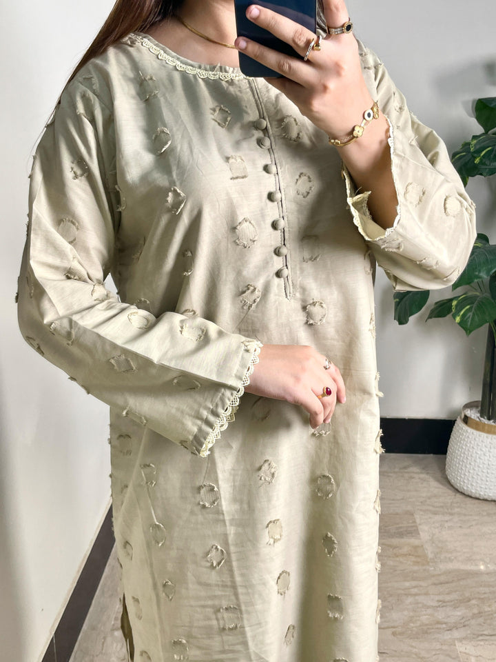 Rangoli lawn collection for summer featuring a 2-piece suit with a chic Alhad Salwar in a relaxed fit. The shirt showcases exquisite Rangoli weaving with intricate motifs and patterns exuding elegance and sophistication. Fabric buttons add a delicate touch to this stunning ensemble.