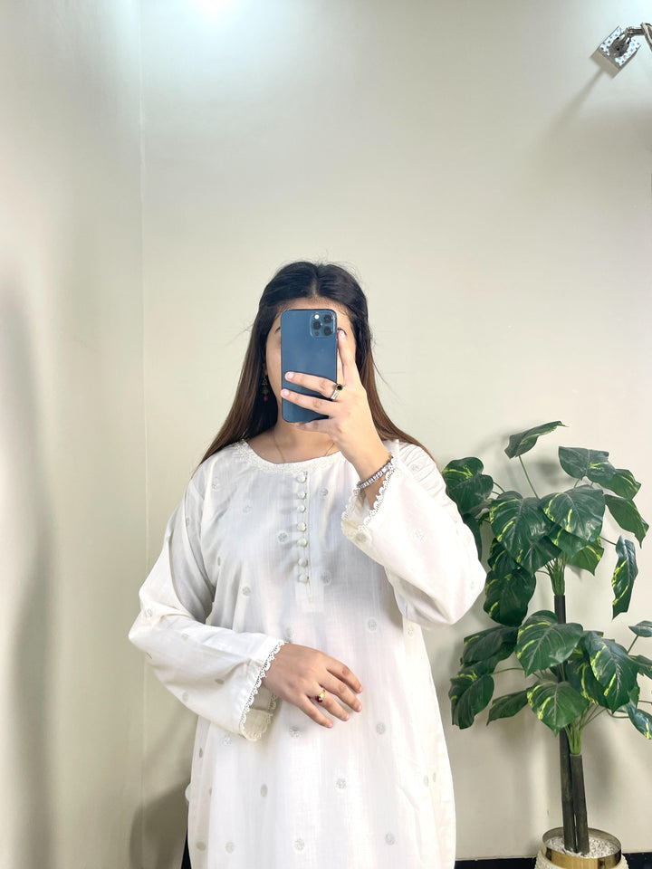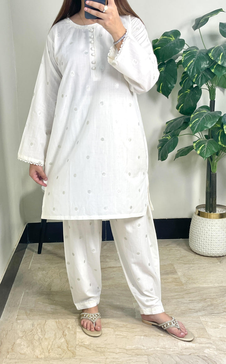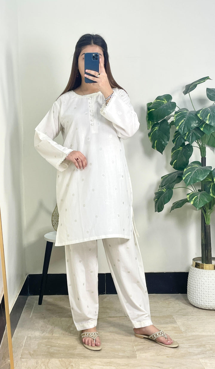 Rangoli lawn collection for summer featuring a 2-piece suit with a chic Alhad Salwar in a relaxed fit. The shirt showcases exquisite Rangoli weaving with intricate motifs and patterns exuding elegance and sophistication. Fabric buttons add a delicate touch to this stunning ensemble.