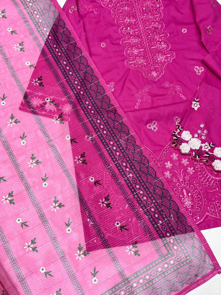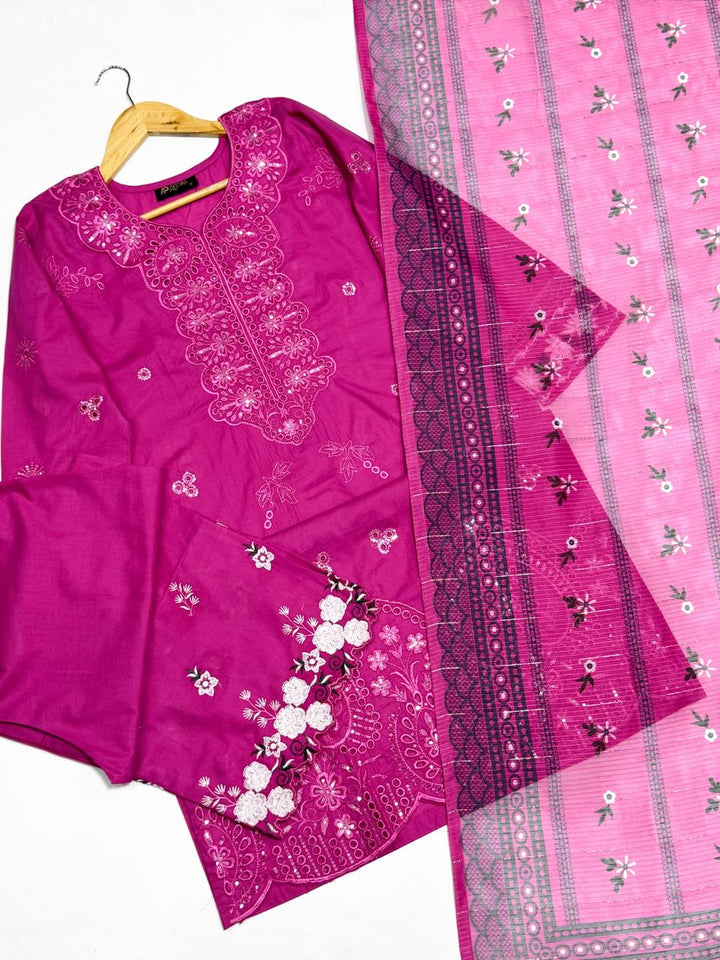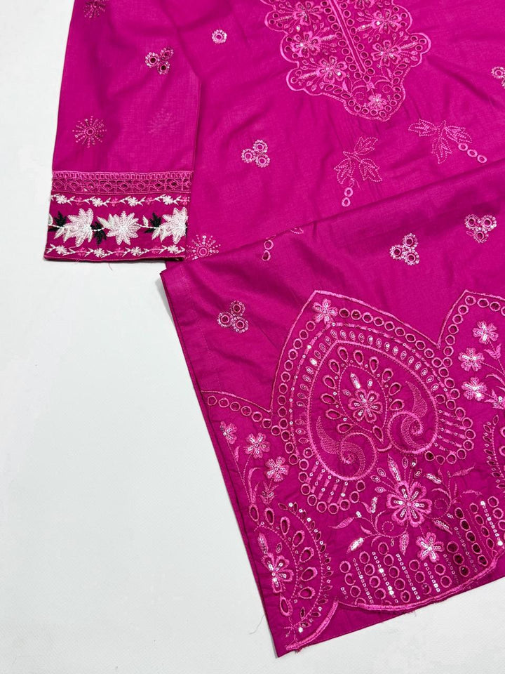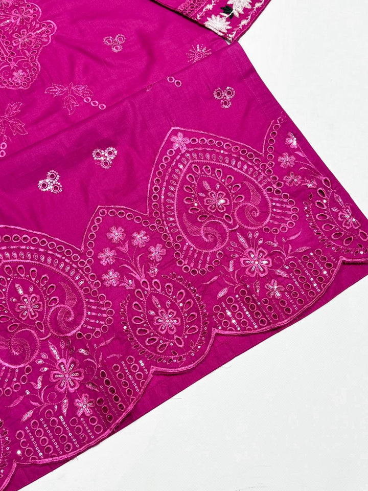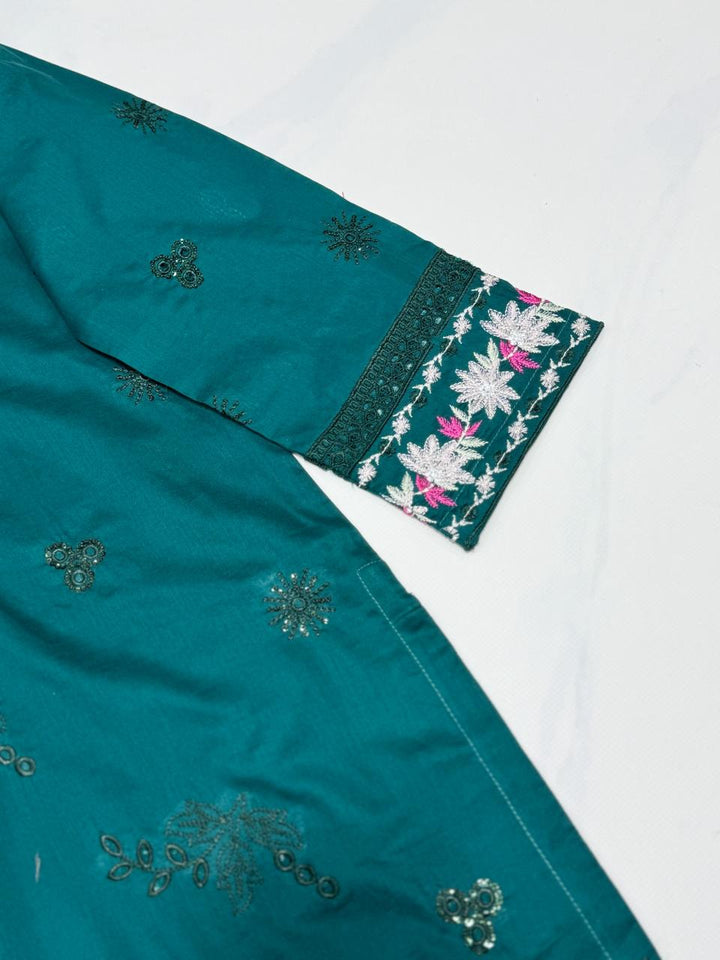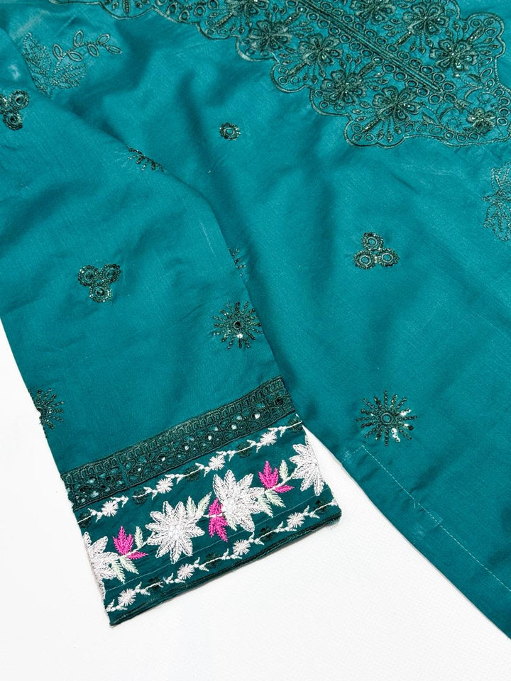 Experience elegance with this 3-piece cotton set featuring delicate sequins and chikankari embroidery on the shirt, paired with a beautifully zari-printed Organza Doria dupatta. The plazo trouser adds a modern touch with multi embroidery on the bottom, creating the perfect blend of grace and sophistication.