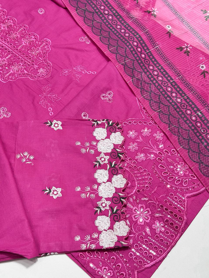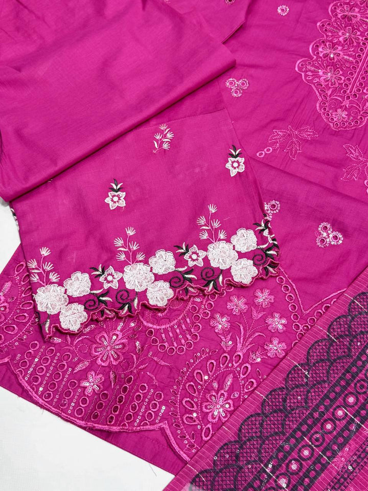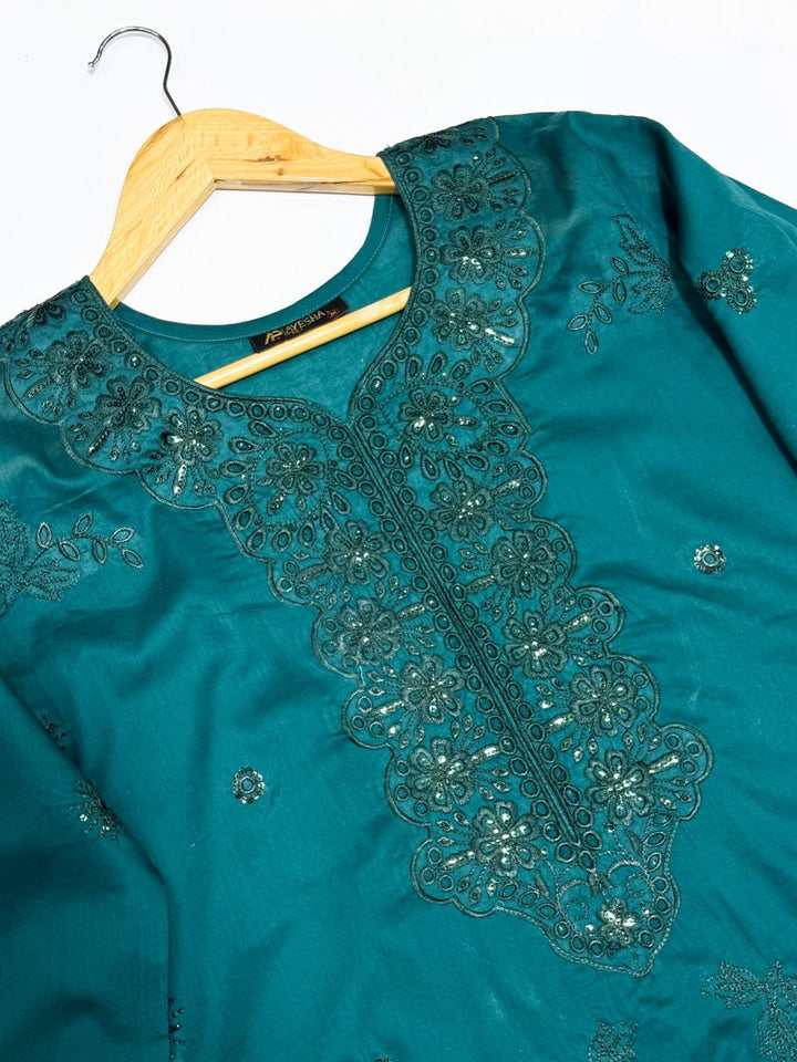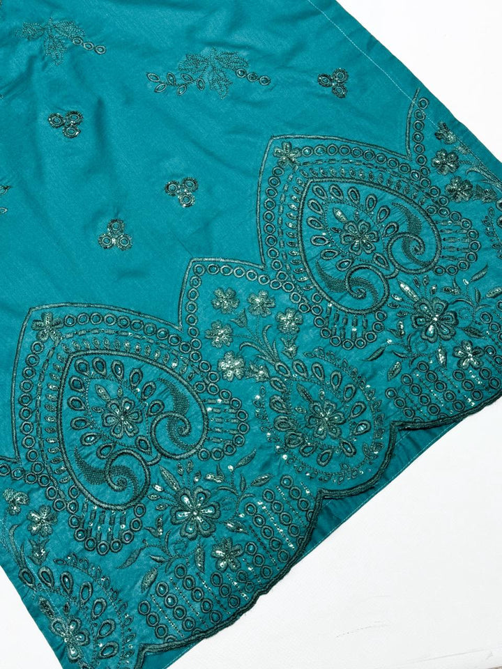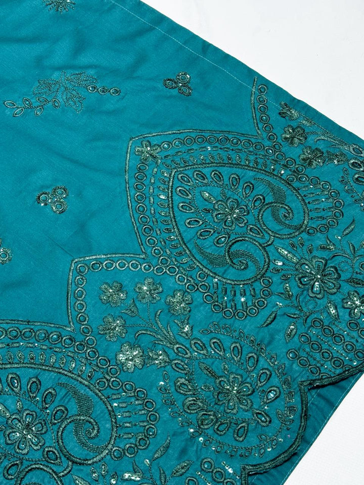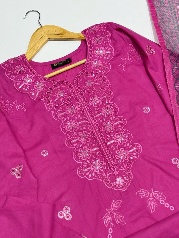Experience elegance with this 3-piece cotton set featuring delicate sequins and chikankari embroidery on the shirt, paired with a beautifully zari-printed Organza Doria dupatta. The plazo trouser adds a modern touch with multi embroidery on the bottom, creating the perfect blend of grace and sophistication.