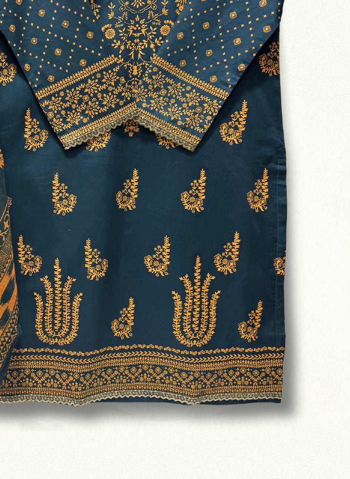 A timeless design featuring a screen-printed shirt enhanced with delicate sequins and lace work on the neck and sleeves.